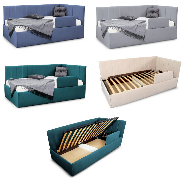 Мягкая обивка из гапоаллергенного велюра. 5 расцветок кровати. Ортопедическое основание и механизм подъема входят в комплект кровати.